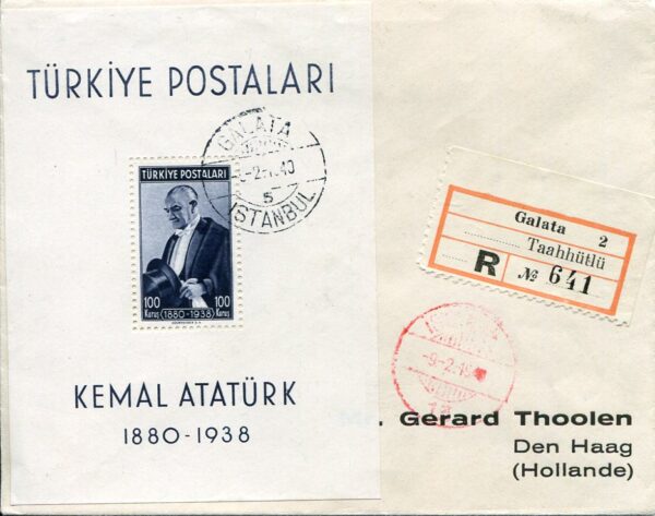 Türkiye: 1940 (9 February). First Anniversary of Death of Kemal Atatürk miniature sheet on registered cover to Netherlands.