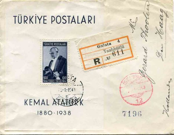 Turkey: 1940 (25 January). 1st Death Anniversary of Ataturk miniature sheet on registered cover to Den Haag, Netherlands tied by Galata datestamp. Reverse no postal markings. Isfila B1