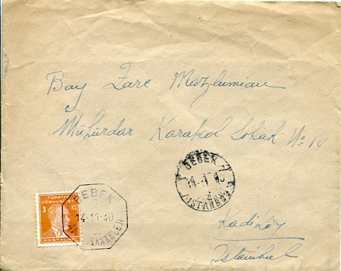 Turkey: 1940 (14 November). A cover with its contents in English from an Armenian student at Robert College used in Istanbul tied by octagonal Bebek Amerikan Koleji and Bebek datestamps. Reverse next day Kadikoy arrival cds.
