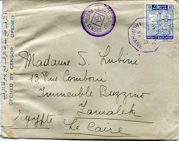 Turkey: 1940 (29 November). Cover to Egypt franked with 10k Balkan Entente commemorative stamp tied by octagonal BEYOGLU TALIMHANE 96 postal agency datestamp. Censored at arrival with Postal Censor 57 handcachet and bilingual Opened By Censor Label. Reverse 11 December Cairo arrival cds.