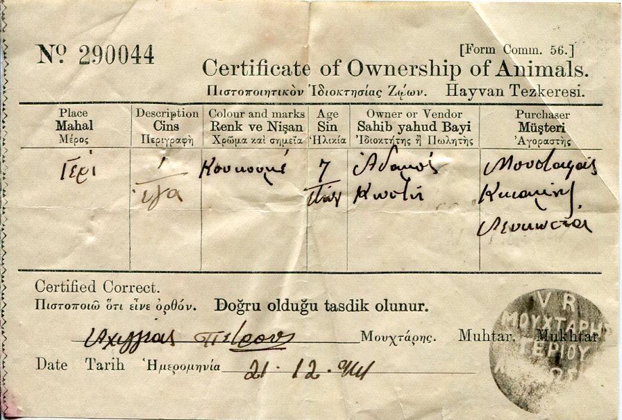 Cyprus: 1941 Certificate of Ownership of Animals struck by V.R. GOURRI of Nicosia Mukhtar seal.