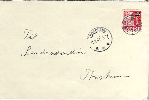 Faroe Islands: British Occupation: 1941 (25.1.) local cover to Torshavn bearing single franking ’20’ on 15o. tied removed-star cancellation Midvaag with Torshavn arrival alongside; fine condition.
