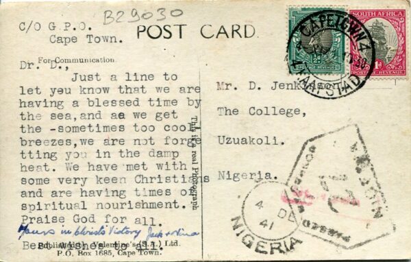 South Africa: 1941 (4 November). Postcard titled ‘Flower Sellers, Adderley Street, Cape Town’ to Uzuakoli, Nigeria franked with 1/2d and 1d. tied by Capetown datestamp, 4 December arrival cds and PASSED BY CENSOR NIGERIA 27 hand cachet.