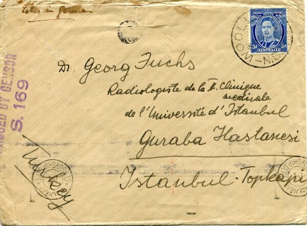 Australia – Turkey: 1941 (January). Cover addressed to Guraba Hospital, Turkey franked with 3d KGVI definitive tied by Woollahra, New South Wales datestamp censored in Sydney with Passed by Censor S.169 handcachet and Opened by Censor label, further censored en route in Egypt and received 4 April Istanbul and 5 April Topkapi arrival cds’s.
