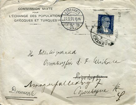Turkey: 1934 (September). Greek and Turkish Population Exchange Commission imprinted cover to Denmark franked with 12 1/2k Ataturk definitive tied by Istanbul datestamp and 11 September Copenhagen arrival cds. Reverse part visit 9 September International Izmir Fair slogan cachet.