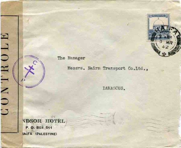 Palestine: 1942 (3 March). Censored Windsor Hotel pre-printed cover addressed to Overland Transport company Nairn Brothers at Damascus franked with 15p and tied by Haifa datestamp. Reverse 7 March machine arrival cancel.