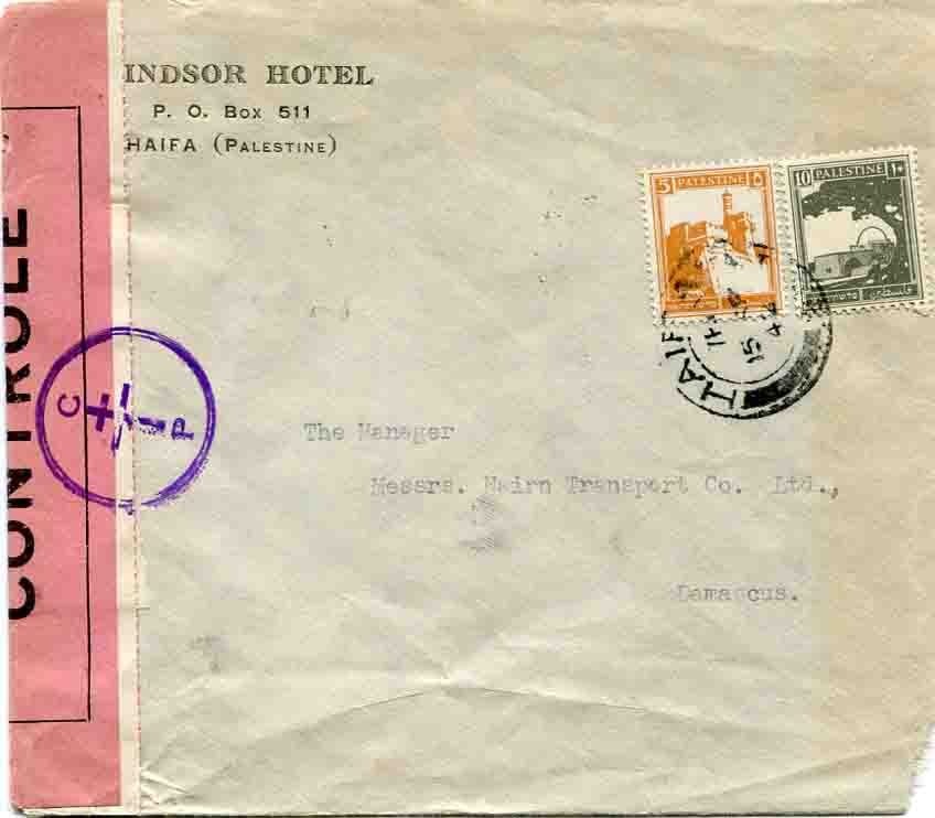 Palestine: 1942 (15 September). Censored Windsor Hotel pre-printed cover addressed to Overland Transport company Nairn Brothers at Damascus franked with 5p and 10p, tied by Haifa datestamp. Reverse 22 September machine arrival cancel.