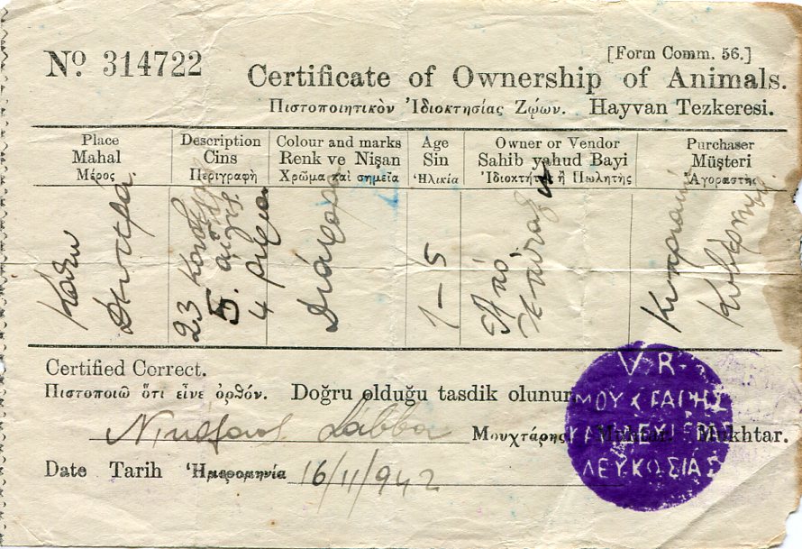 Cyprus: 1942 Certificate of Ownership of Animals struck by V.R. KATO DEFTERA of Nicosia Mukhtar seal.