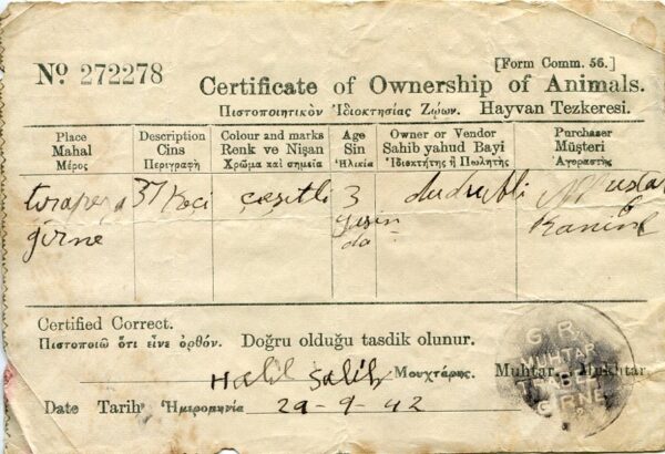 Cyprus: 1942 Certificate of Ownership of Animals struck by G.R. TRAPEZA GIRNE of Kyrenia Mukhtar seal.
