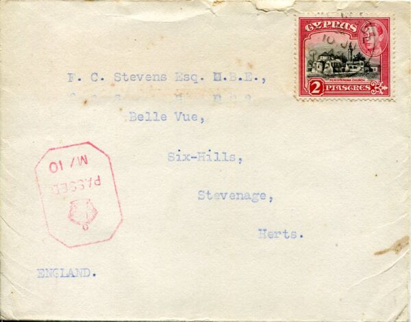 Cyprus: 1942 (10 July). Cover from Mitzis School, Lemythou to Stevenage, England franked with 2pi of KGI stamp tied by Limassol datestamp and red PASSED M/10 censor cachet.