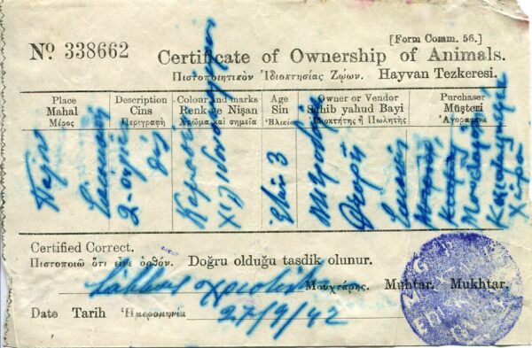 Cyprus: 1942 Certificate of Ownership of Animals struck by G.R. EPISKOPI of Paphos Mukhtar seal.