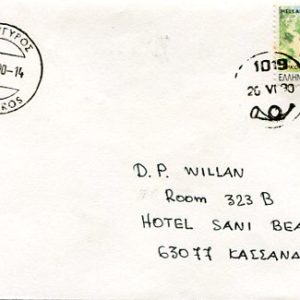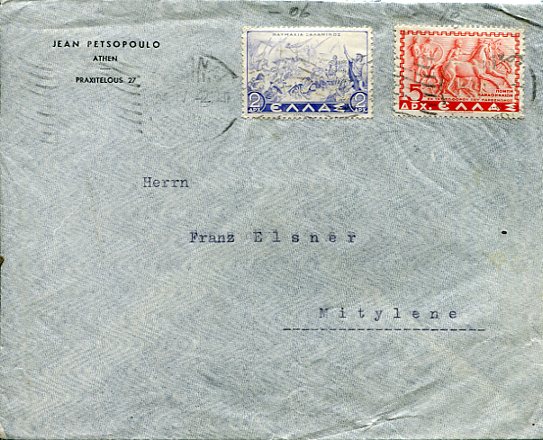 Greece: 1942 commercial cover to Mytilene Island franked with 2d and 5d tied by Athens datestamp. Reverse blank.