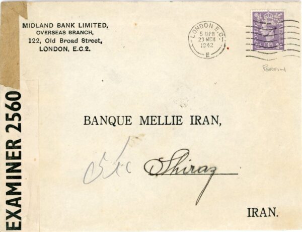 Great Britain – Iran: 1942 Midland Bank censored cover with MB perfin addressed to Banque Mellie, Shiraz. Reverse Bushire transit and arrival cds’s.