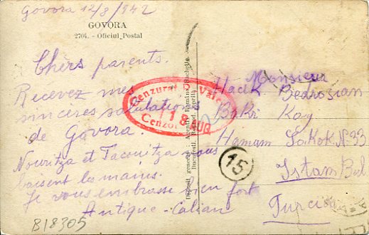 Romania: 1942 photocard of Govora to Istanbul with red oval censor cachet on reverse. Stamps fallen.