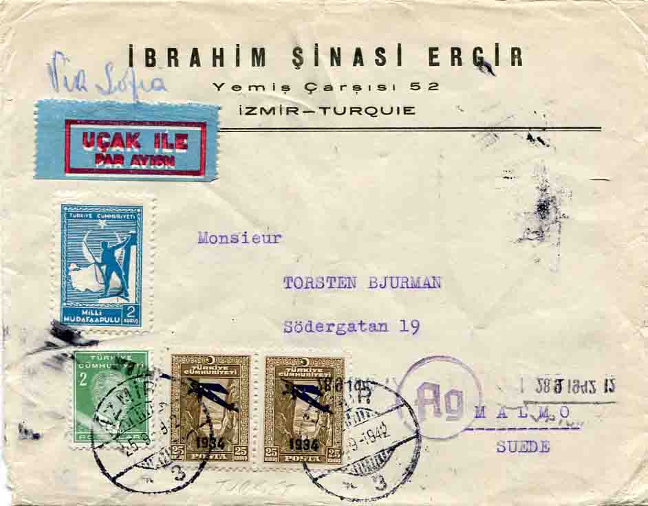 Turkey: 1942 (25 Sept). Commercial cover to Malmo, Sweden franked with pair of 25k overprinted 1st Airmail stamps tied by Izmir 3 date stamps. Reverse Istanbul 28.9 and 1.X Wien transit cancels. Isfila 1313