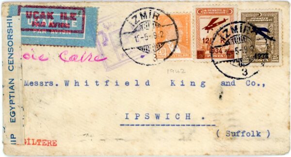 Türkiye: 1942 cover to Ipswich franked with 12 1/2k and 25k Air Mail stamps tied by Izmir datestamps and Egyptian censor cachet over label. Reverse 1k National Defence obligatory tax tied by Cairo transit cds.