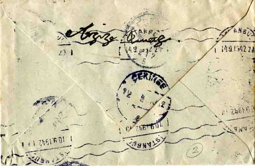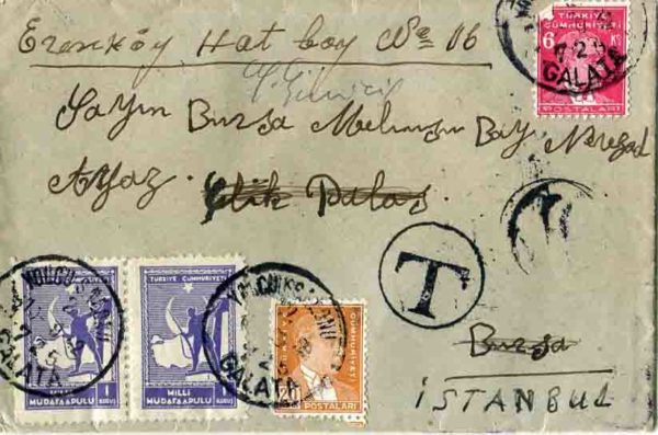 Turkey: 1942 (10 September). Cover from Istanbul to Bursa franked with 20pa and 6k of Ataturk definitives and pair of 1k National Defence obligatory tax stamps. Since the cover sent by correct internal letter rate it was probably taxed for return to sender fee.