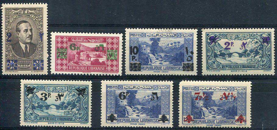Lebanon: 1943-45 various surcharges on Present Edde and landscapes mint o.g. set of seven. Sg. 258/264