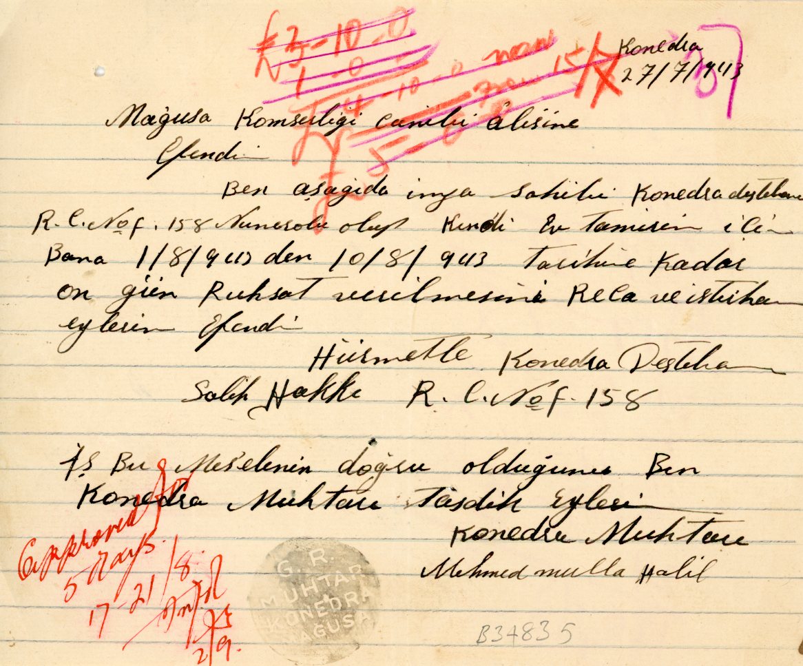 1943 document with G.R. MUHTAR KONEDRA MAGUSA negative seal