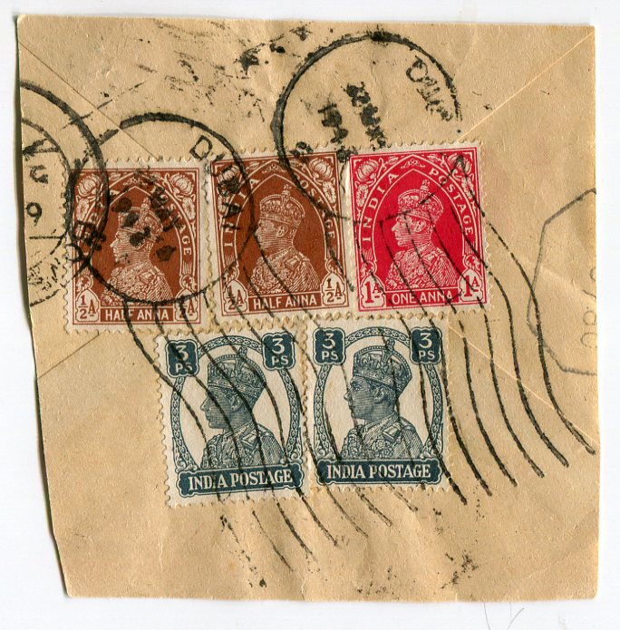 India Used Abroad – Dubai: 1943 (22 May). India KGVI two 5ps, two 1/2a and 1a on piece struck by DUBAI datestamps, part Bombay arrival cds and censor cachet.