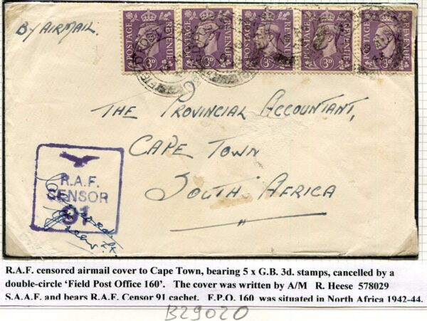 Egypt: 1943 FPO 160 airmail cover with RAF censor to Cape Town, South Africa