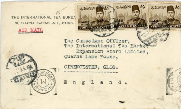 Egypt: 1943 The International Tea Bureau imprinted censored cover to Cirencester, England.