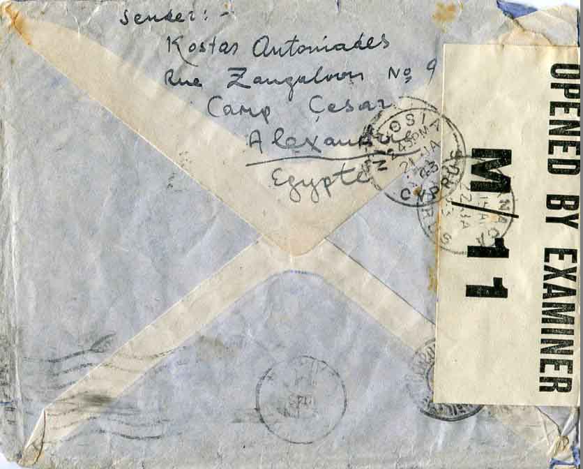 Egypt: 1943 (5 January). Censored cover to Cyprus franked with 2m and 15m definitives tied by Alexandria datestamps and Egyptian censor cachet. Censored at arrival with white M/11 label and 21 January Nicosia and next day Larnaca arrival cds’s.