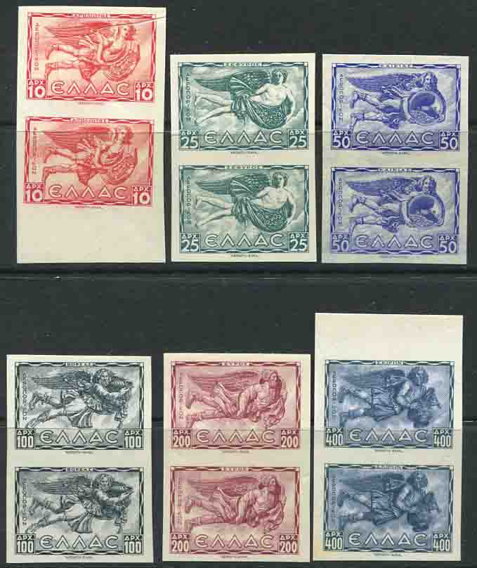 Greece: 1943 (15 Sept). Winds second airmail issue unmounted mint complete set of six in imperforate vertical pairs. 400d has some rust spots on reverse. Hellas A61a/A66a