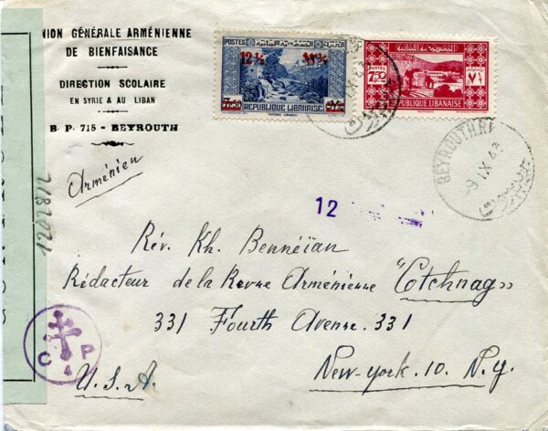 Lebanon: 1943 (9 September). ‘Union Générale Arménienne De Bienfaisance’ imprinted cover to United States franked with 12 /12p on 7p50 and 7p50 pictorial stamps tied by Beyrouth datestamps and French green CONTROLE censor label.