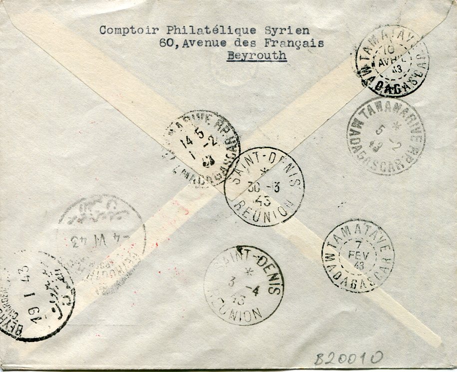 Lebanon: 1943 (19 January). Registered first flight cover by Lignes Aeriennes Militaires LAM to St. Denis, Reunion via Damascus, Djibouti and Tananarive & Tamata, Madagascar franked with Anniversary of Proclamation of Independence airmail set of two tied by Beyrouth datestamps and FRANCE LIBRE first flight handcachet. Reverse transit and 30 March arrival cds’s. Returned to sender with 4 June arrival cds. Sg. 256/257