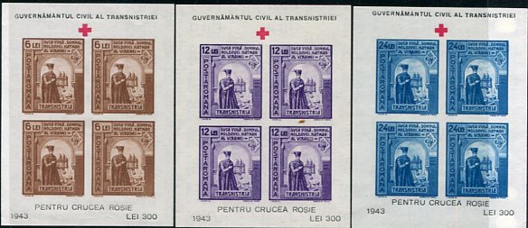 Romania: 1943. Red Cross aid stamps issued by the Transdniestria Civil Government ungummed (as issued) sheets of four set of three.