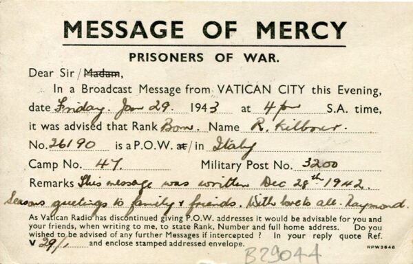 South Africa – Vatican: 1943 Vatican Radio ‘Message of Mercy / Prisoners of War’ card used in South Africa from Cape Town to Johannesburg.