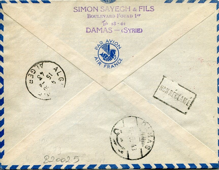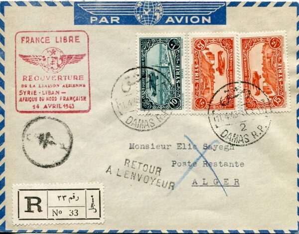 Syria: 1943 (11 April). France Libre registered airmail cover to Algeria franked with 10p and two 15p airmail stamps tied by Damas datestamps and ‘Return to Sender’ handcachet. Reverse ‘Non Reclame’ handstamp, 15 April Alger and 12 May Damas cds’s. Sg. 266, 267