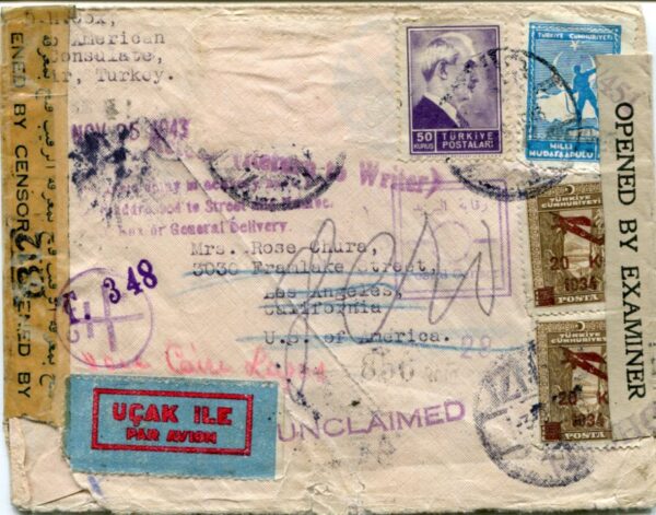 Turkey: 1943 (October). Censored airmail cover via Egypt and Lagos to United States franked with 50k Inonu definitive, two 20k aeroplane surcharged on 25k and 2k National Defence obligatory tax stamps (one stamp missing) tied by Izmir datestamps. Unclaimed and returned to sender.
