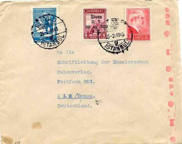 Turkey: 1943 (25 Feb). Censored cover to Ulm, Germany franked with 4K on 5k of 1930 opening of Ankara – Sivas railway line surcharged commemorative, 6k Inonu definitive and 2k National Defence obligatory stamps tied by Beyoglu – Istanbul date stamps. Censored on arrival. Reverse no postal markings. Very late usage. Isfila 1241