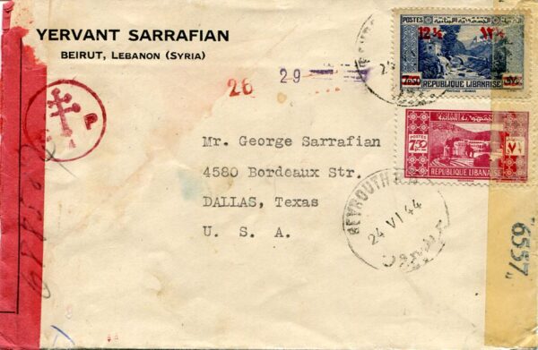 Lebanon: 1944 (24 June). Armenian merchant ‘Yervant Sarrafian’ imprinted cover to United States franked with 7p50 and 12 1/2p on 7p50 pictorial stamps tied by Beyrouth datestamps, red French CONTROLE and EXAMINED BY 6557 British labels and red Free French Forces censor cachet.