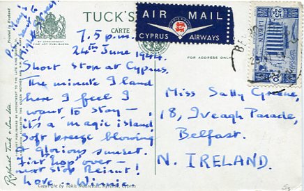 Lebanon – Cyprus: 1944 (24 June). Tuck’s picture postcard titled ‘Troodos #17’ to Northern Ireland franked with 25p pictorial stamp tied by Beyrouth datestamp with AIR MAIL – CYPRUS AIRWAYS label.