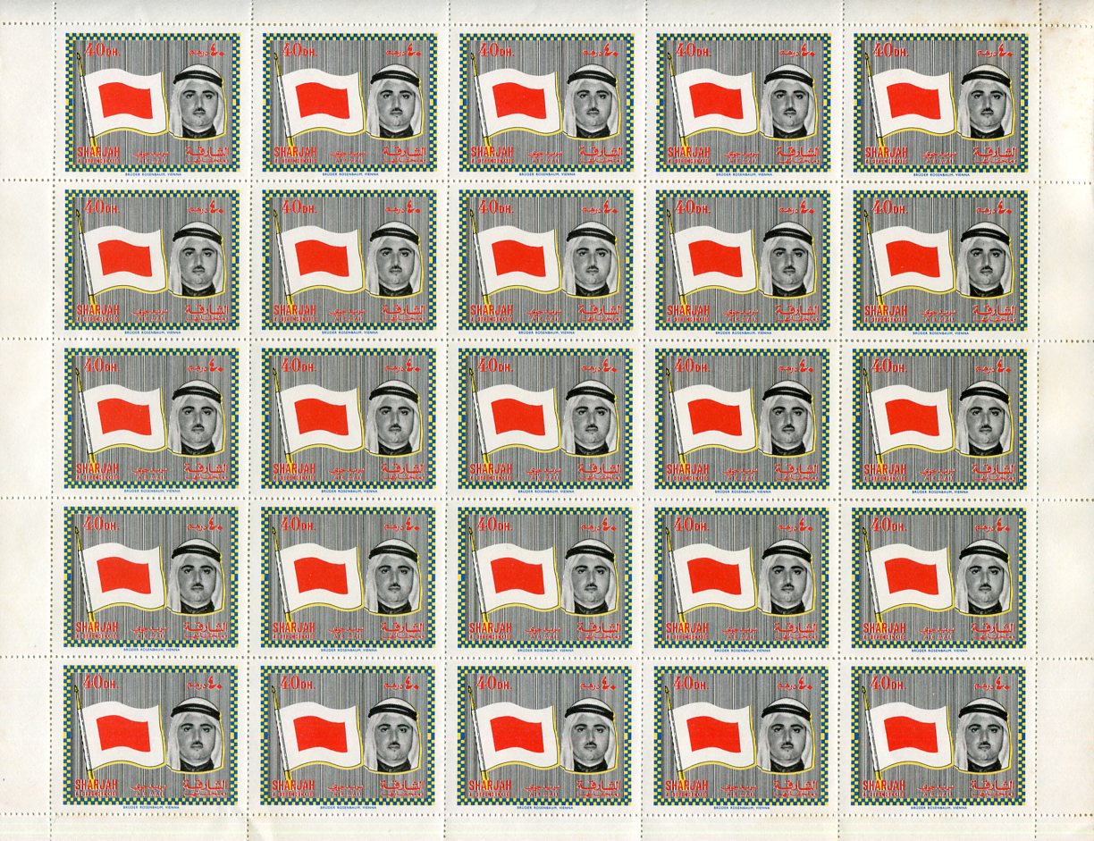 Sharjah and Dependencies: 1968 (25 May). Sheikh Khalid and Flag 40d. unmounted mint sheet of 25. Sg. 260. **