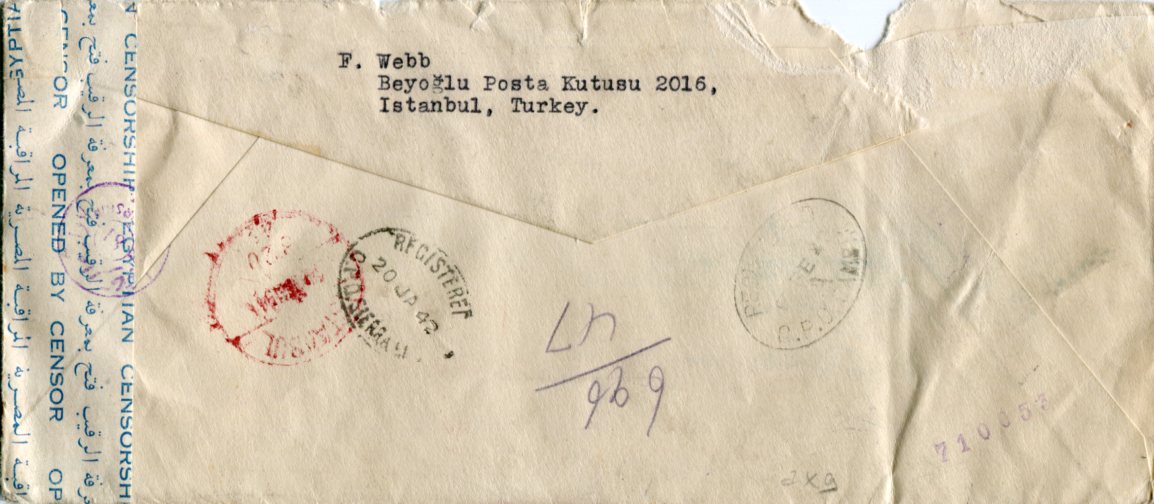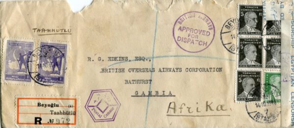 Turkey: 1944 (14 October). Registered cover to Gambia franked with 2 1/2k, five 5k Atatürk portrait definitives and two 1pi National Defence obligatory tax stamps tied by Beyoglu, Istanbul datestamps and very scarce BRITISH AIRWAYS / APPROVED / FOR / DISPATCH circular hand stamp, Egyptian censor label and on reverse 20 January Sierra Leone transit and 9 February Gambia arrival ds’s.