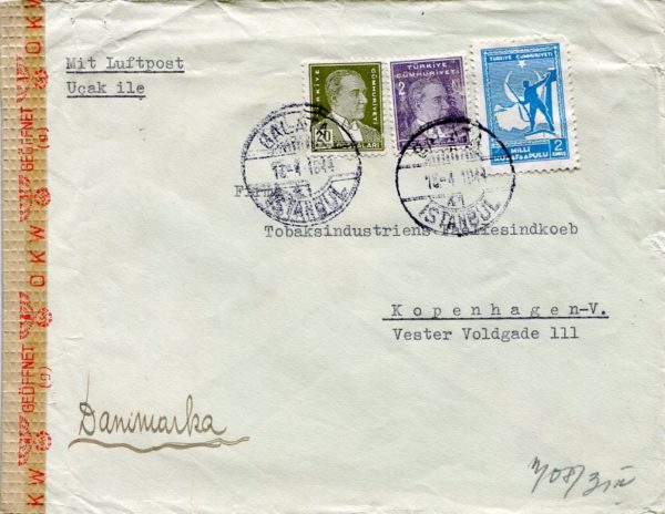 Turkey: 1944 (13 April). Commercial airmail cover carried by Lufthansa Continental Network to Copenhagen, Denmark via Sofia franked with 2k and 20k of Ataturk definitives and 2k National Defence obligatory tax stamp tied by Galata – Istanbul datestamps. Opened and censored with German label. ex. W. Robertson