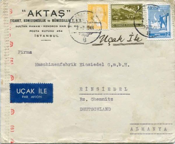 Turkey: 1944 (2 July). Commercial airmail cover by Lufthansa to Germany franked with 1k pictorial, 15k Ataturk definitive and 2k National Defence obligatory tax stamps tied by Istanbul datestamps, censored in Vienna. Cover sent one month before Turkey broke off relations with Germany. ex. W. Robertson