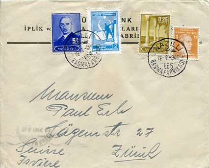 Turkey: 1944 (18 April). Chintz – Cotton – Spinning Mill factory headed cover to Switzerland franked with 3k Ataturk, 6 3/4 Inonu definitive 0.25k pictorial and 2k National Defence stamps tied by NAZILLI BASMA FABRIKASI (Chintz Factory) datestamps. Reverse 21 April Istanbul transit machine cancellation.