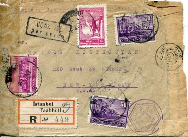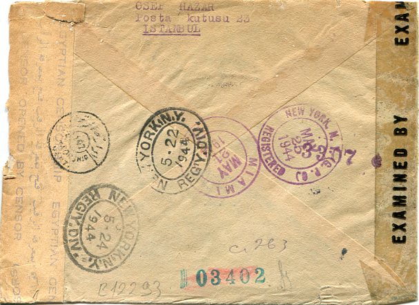 Turkey: 1944 (8 April). Commercial registered airmail cover to United States franked with 13 1/2 and two 50k pictorial and 4k National Defence obligatory tax stamps tied by Istanbul datestamps. Opened out and examined in Egypt with two censor labels and cachets. Reverse 21 May Miami, Florida transit and 22 & 24 & 25 May New York arrival cds’s.