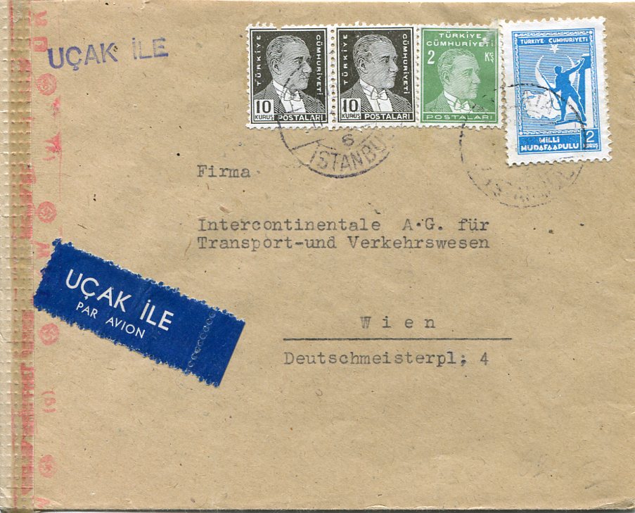 Turkey: 1944 shipping line firm airmail cover to Vienna franked with Ataturk definitives and 2k National Defence obligatory tax stamp tied by Istanbul datestamps.