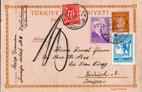 Turkey: 1944 (7 May). 3k Ataturk postal stationery card uprated with 1 1/2k Inonu definitive and additionally 2k National Defence obligatory tax stamps to Switzerland tied by Galata – Istanbul datestamp and ’10’ by black crayon indicating postal tax franked with 10c postage due stamp on arrival tied by Zurich 16 May arrival cds.