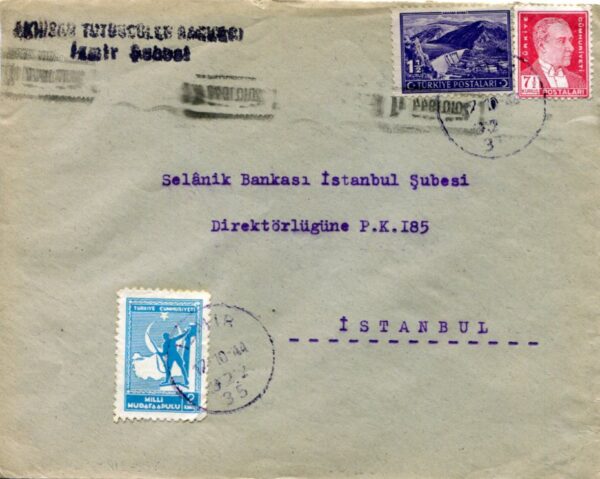 Turkey: 1944 (17 October). Akhisar Tutunculer Bankasi (Tobacconist Bank) cover to Istanbul franked with 7 1/2k Atatürk definitive, 1 1/2k pictorial and 2k National Defence obligatory tax stamps tied by Izmir datestamps. Reverse 20 October arrival cds.