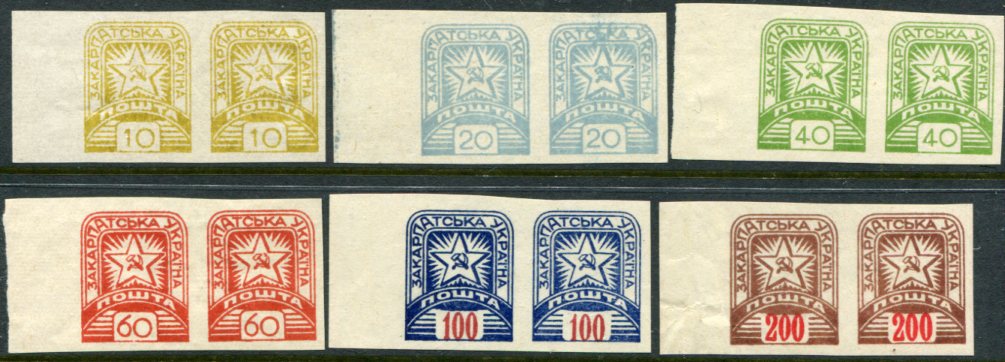 Carpatho – Ukraine: 1945 Soviet Star imperforate pair unmounted mint set. Seldom seen. Mi. 81U/86U. **