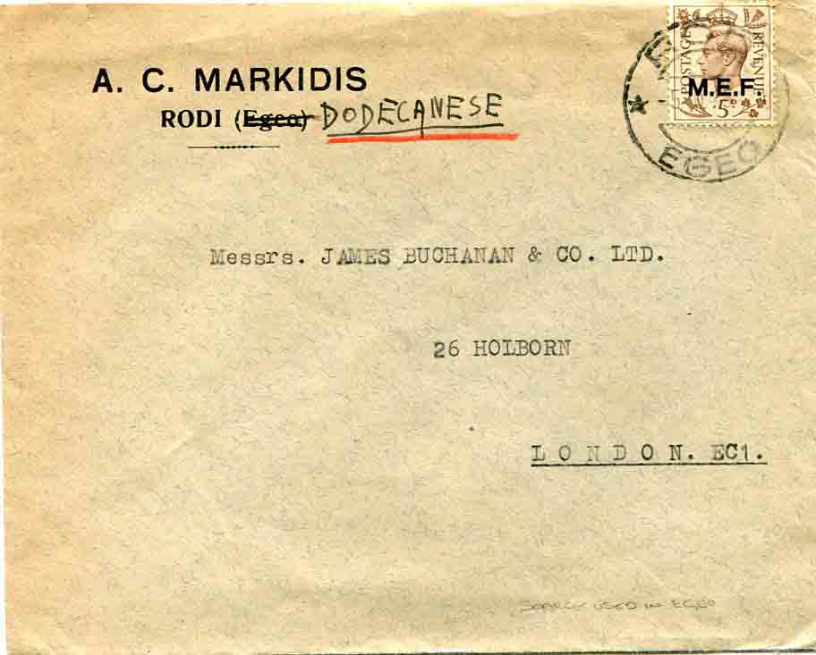 Greece: 1945 (5 October). Commercial cover from Rhodes to London franked with British Occupation of Italian Colonies 5d Great Britain stamp overprinted M.E.F. tied by RODI * EGEO datestamp. SG M15