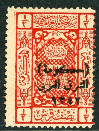 Transjordan: 1924 official 1/2p. Hejaz stamp overprinted ‘”Arab Government of the East 1342″ mint o.g. Sg. O117. *