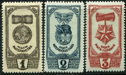 Russia – USSR: 1945 (16 December). Orders and Medals of Motherhood unmounted mint set. Mi. 994/996, Sg. 1120/1122, Zagor. 918/920